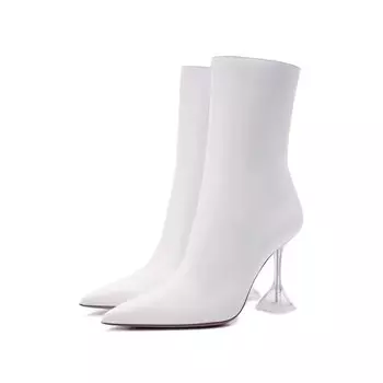 Amina Muaddi130000 ₽Белые лаконичные ботильоны из мелкозернистой кожи наппа с зауженным мысом и высоким фигурным каблуком.