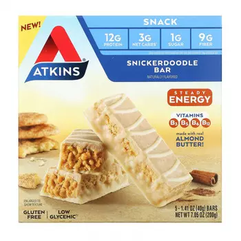 Акткинс2096 ₽1887 ₽-9%Atkins, Snickerdoodle Bar, Gluten Free, 5 Bars, 1.41 oz (40 g) Each | Пищевая ценностьРазмер порции: 1 батончик (40 г)Порций в упаковке: 5 Количество в 1 порции% от суточной нормы*Калории160 Всего жир...