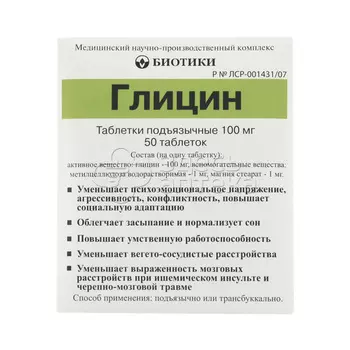 Биотики МНПК80 ₽Глицин 100мг №100 табл. подъязычные Биотики | Код товара: 00-00007863. Описание: Глицин 100мг №100 табл. подъязычные Биотики ИНСТРУКЦИЯ по медицинскому применению лекарственного препарата ГЛИЦ...
