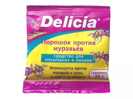 DELICIA65 ₽Порошок от муравьев 30 г | **Порошок против муравьев Delicia** — активная пищевая приманка на основе хлорпирифоса. Может применяться в сухом или растворенном виде. Рассыпанный порошок переносится в му...