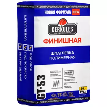 GERKULES771 ₽Шпатлевка финишная Gerkules GT-53 полимерная 20 кг | **Шпатлевка финишная Геркулес** GT-53 на основе полимерного вяжущего — материал, предназначенный для обработки тонких слоев бетонных поверхностей, ...