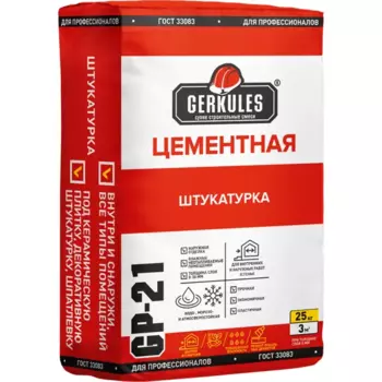 GERKULES392 ₽Штукатурка цементная Gerkules GP-21 25кг | **Штукатурка цементная Геркулес GP-21** — это сухая цементная выравнивающая штукатурная смесь. Основной компонент — портландцемент, в который добавляют с доб...
