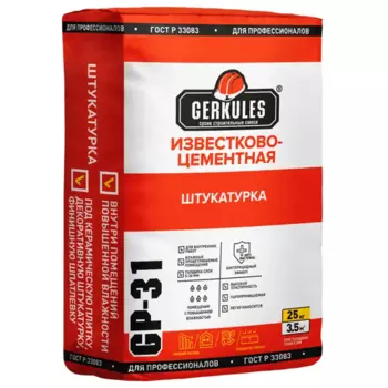 GERKULES460 ₽Штукатурка цементно-известковая Gerkules GP-31 25 кг | **Штукатурка цементно-известковая Геркулес GP-31** производится специально для отделки стен внутри помещений. Она подходит для влажных, хорошо пр...