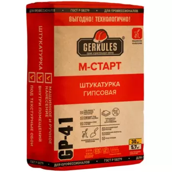 GERKULES880 ₽Штукатурка гипсовая Gerkules Старт GP-41 30 кг | **Штукатурка М-Старт GP-41** предназначена для однослойного оштукатуривания стен и потолков внутри помещений с нормальной влажностью, в том числе кухни...