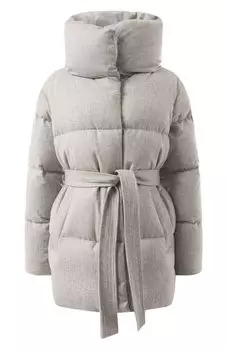HETREGO119800 ₽83860 ₽-30%Пуховик из стеганого кашемира с высоким воротом и поясом в тон | Женский пуховик из коллекции Hetrego выполнен из плотного стеганого кашемира в меланжево-сером оттенке. Наполнитель из пуха и пера подч...
