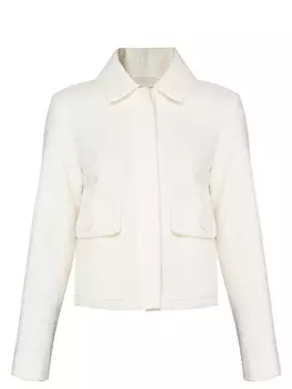 IRKE46900 ₽32830 ₽-30%Белый шерстяной жакет с классическим отложным воротником, длинными рукавами, накладными карманами и застежкой на пуговицы. Подклад из шелка.