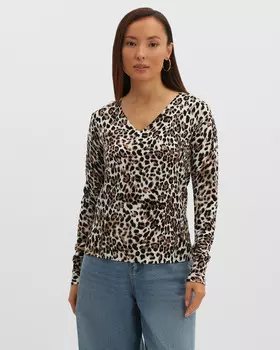 Lilly Bennet4990 ₽Блузка свободного силуэта с леопардовым принтом и воланами | Леопардовый принт Воздушные воланы Прямой крой Круглый вырез Металлизированная нить в составе Размер на модели: S Параметры модели: 78...