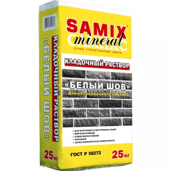 SAMIX458 ₽Раствор для кладки кирпича Samix белый 25 кг | **Раствор для кладки кирпича Samix** — сухая строительная смесь, которая легко наносится на поверхность. Применяется для кладки облицовочного кирпича. По...