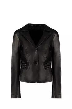 Vespucci67000 ₽Стильный женский пиджак из мягкой натуральной телячьей кожи чёрного цвета с контрастными геометрическими вставками спереди и по бокам.