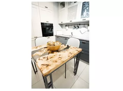 Woodzpro131990 ₽Обеденный стол (woodzpro) голубой 80.0x75.0x145.0 см. | Стильный обеденный стол из карагача с голубой рекой, станет прекрасным дополнением интерьера кухни или столовой в стиле лофт. Материал: Карагач....