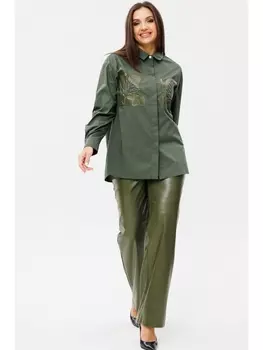 Ma Сherie9918 ₽Брючные костюмы 3100 хаки | Двухпредметный комплект Ma Сhrie, состоящий из хлопковой рубашки и брюк из экокожи. Рубашка прямого силуэта. Воротник отложной на стойке. Застежка центральная потайная на п...