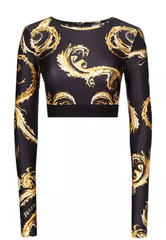 Versace Jeans Couture23200 ₽Топ с длинными рукавами-митенками из мягкой гладкой микрофибры, позволяющей коже дышать. На поверхности эластичного материала нанесен золотистый брендированный паттерн в барочном стиле.