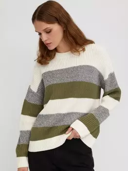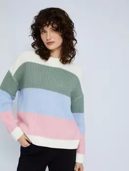 zolla1499 ₽Вязаный женский джемпер в полоску с длинным рукавом, выполненный в стиле Color Blocking. Объёмный силуэт, круглый вырез и спущенная линия плеча. Подходит для учёбы, работы или повседневных дел.