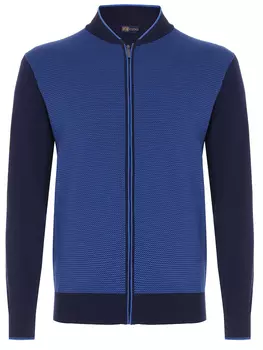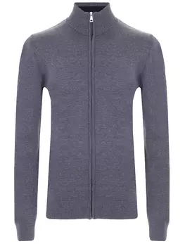 Cudgi9300 ₽Темно-синий кардиган на молнии из мягкого хлопкового трикотажа с воротником-стойкой, длинными рукавами и рельефной обвязкой манжетов и пояса.