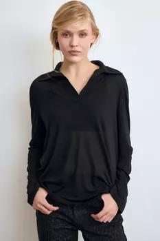Mollis3999 ₽Джемпер с воротником поло из вискозы, легкая прозрачность придает ему утонченность. Носим с топом и жакетом, джинсами или классическими брюками, минималистичными украшениями. Черный цвет.