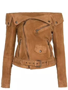 Faith Connexion120500 ₽72300 ₽-40%Кожаная куртка синего цвета с открытыми плечами и зоной декольте, длинными рукавами, шлевками и поясом с пряжкой. Застежка-молния по косой, прорезные карманы на молнии с клапаном.