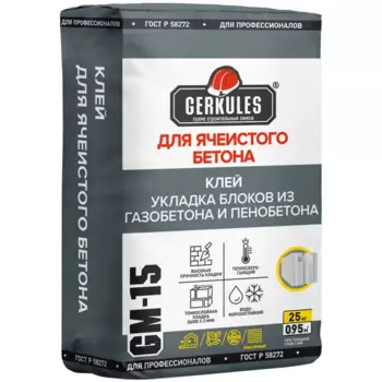 GERKULES378 ₽Клей для блоков Gerkules GM-15 25 кг | Клей «Геркулес» — сухая смесь для приготовления кладочного раствора. Применяется при строительстве наружных и внутренних стен из ячеистого бетона. Специальные до...