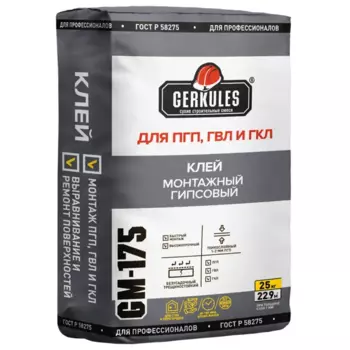 GERKULES194 ₽Клей гипсовый монтажный Gerkules GM-175 25 кг | Клей для ПГП и ГКЛ «Геркулес» GM-175 в упаковке 25 кг предназначен для строительных и монтажных работ. Позволяет быстро и надёжно закрепить гипсокартонн...