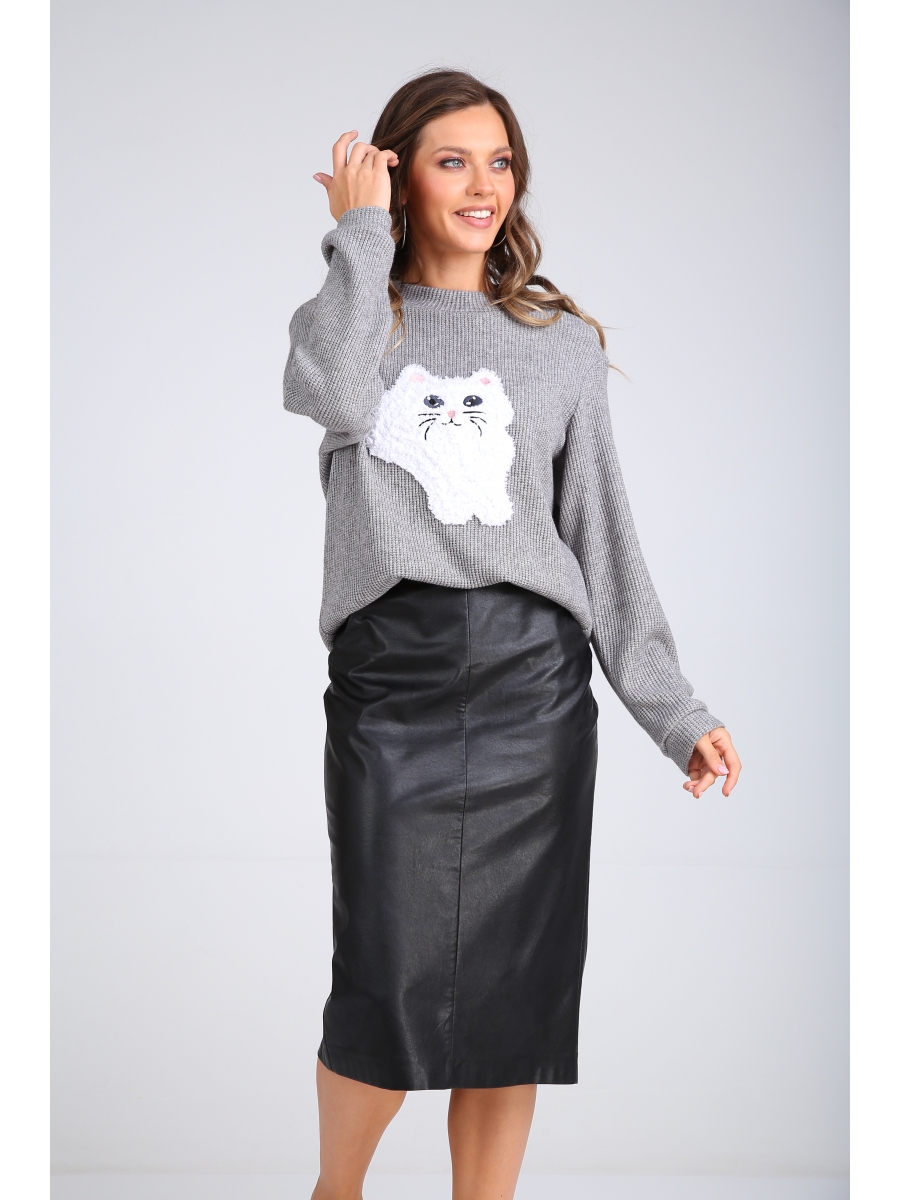 Sandyna5227 ₽Женский джемпер прямого силуэта, серого цвета, из мягкой ткани. Полочка и спинка цельнокроенные, плечо спущенное, рукав втачной. Манжета по низу рукава и притачный пояс по низу изделия. Горловина окру...