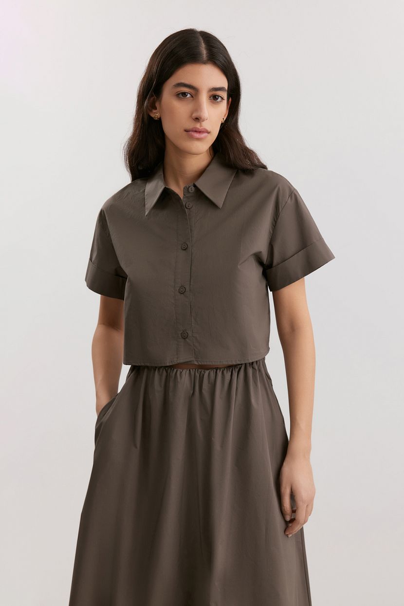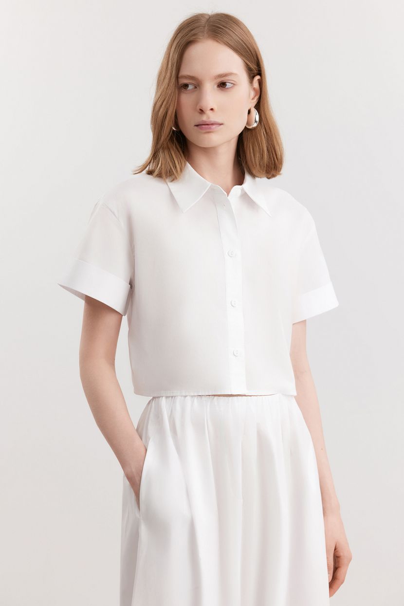 BAON5599 ₽3299 ₽-41%Женская блузка из хлопкового поплина, лёгкая и дышащая, с классическим воротником и застёжкой на пуговицы.