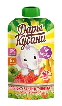 Дары Кубани39 ₽Пюре фруктовое Дары Кубани яблоко\банан\клубника 90г | Срок годности (в днях): 365. Категория: пюре детское, детское питание. Страна: Россия.