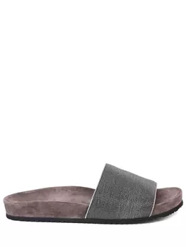 BRUNELLO CUCINELLI129500 ₽90650 ₽-30%Шлепанцы замшевые | -Темно-серые шлепанцы Precious из фактурной замши ламе от BRUNELLO CUCINELLI. -Особая отделка, придающая оттенку слегка размытый и блестящий эффект, сочетается с широкой полосой, с...