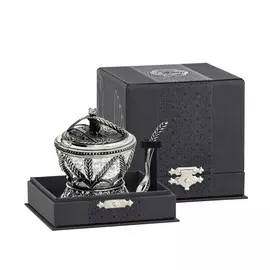 Бронницкий Ювелир9090 ₽Солонка КМ1410206 | Солонка \"Колосок\" посеребренная полированная с чернью с ложкой в футляре. Состав Солонка, хрустальная вставка, ложка для соли, футляр подарочный Металл: Мельхиор Без пробы Вставк...