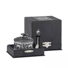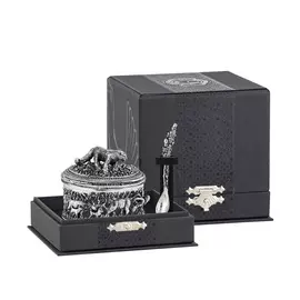 Бронницкий Ювелир9090 ₽Солонка КМ247СЛ06_8 | Солонка \"Барс\" посеребренная полированная с чернью с ложкой в футляре. Состав Солонка, хрустальная вставка, ложка для соли, футляр подарочный Металл: Мельхиор Без пробы Вставка...
