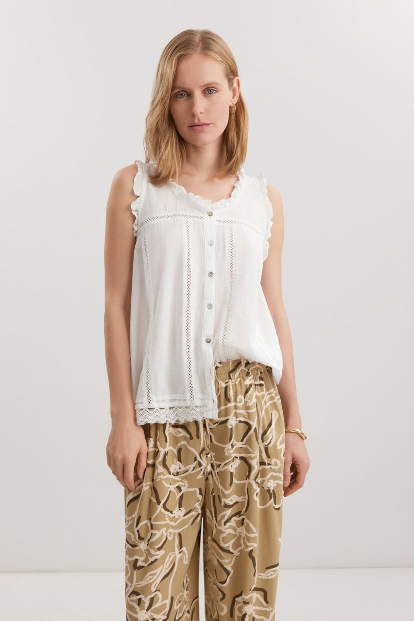 BAON4599 ₽3199 ₽-30%Женский топ из хлопкового батиста, лёгкий и дышащий, идеально подходит для жарких дней. Модель имеет свободный крой до бедра с круглым вырезом. Отделка включает кружево, мережку и рюши по проймам и го...