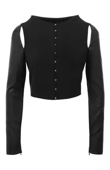Del Core108500 ₽Топ Del Core | Черный топ в исполнении дизайнеров марки выглядит, будто его собрали из двух вещей. Такой эффект создают незашитые спереди проймы и контраст фактур. Модель выполнили из приятной на ощуп...