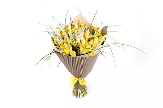 СоюзЦветТорг3290 ₽Букет с ирисами Золотой ирис в бумаге | Букет из желтых и белых ирисов в стильной оберточной бумаге, окруженный свежей зеленью – это милый и, безусловно, приятный презент, который принесет радость и х...