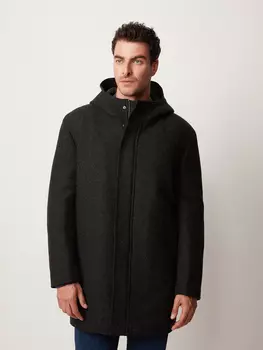 20line24999 ₽17499 ₽-30%Пальто с капюшоном черного меланжевого оттенка, выполнено из плотного шерстяного материала. Модель прямого силуэта с длинным рукавом, центральной застёжкой на планку и высоким воротником, переходящим ...