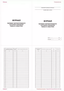 ЗнакПром72 ₽Журналы ЗнакПром | Журнал проверки противопожарного состояния помещений перед их закрытием Функционал: Журнал. Материал: (пусто). Тип полиграфии: Журнал. Тип: (пусто). Размер, мм: Не указан. Категория...
